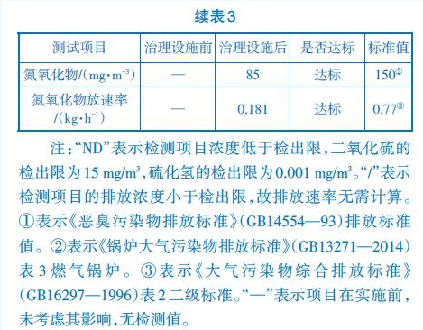 該臭氣處理工程完工后,系統運行情況良好,臭氣處理效果達到標準要求,主要污染物硫化氫、氨氣、臭氣去除率分別為76%、79%、45%。具體運行情況見表3。