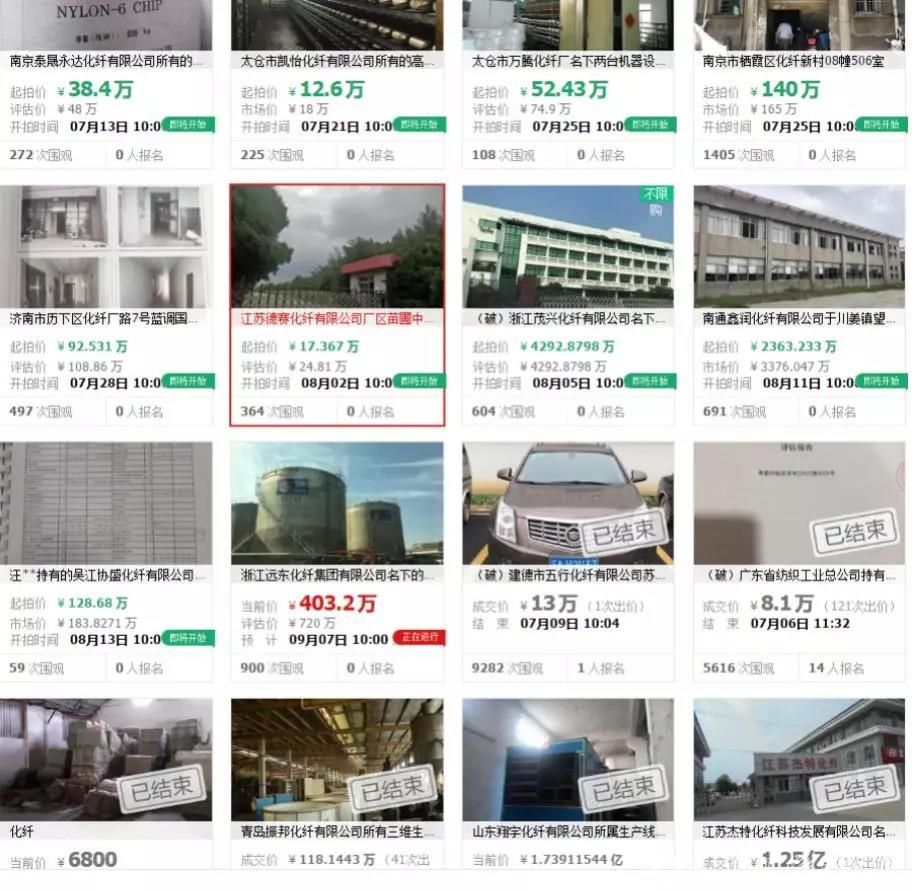 企業的廠房、設備,老板的資產、車輛,甚至是廠區的樹苗,土地都進行了司法拍賣,以下為小編整理的近期部分化纖企業司法拍賣的情況統計: