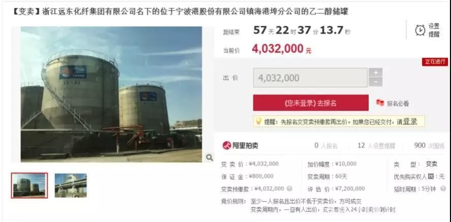 除此之外,企業破產清算之后,剩下的設備物品可謂是“清倉大甩賣”了,大到車輛土地,小到空調打印機,全都在進行打包出售,起拍價格也從幾萬到幾千萬不等。在此次統計的數據當中,正在進行的是浙江遠東化纖集團名下的位于寧波港股份有限公司鎮海港埠分公司的乙二醇儲罐做起拍價4032000元再次進行司法拍賣。