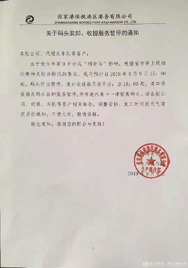 其中,張家港保稅港區港務有限公司發出“關于碼頭裝卸、收提服務暫停的通知”。以下是通知內容: