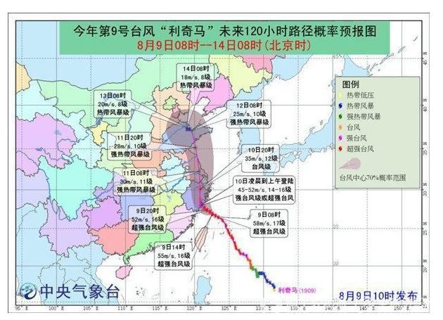 中央氣象臺今早(9日)10點繼續發布臺風紅色預警:今年第9號臺風“利奇馬”(超強臺風級)預計將于10日凌晨到上午在浙江象山到蒼南一帶沿海登陸,最大可能在浙江臺州到樂清一帶沿海登陸(強臺風級或超強臺風級,14-16級,45-52米/秒)。