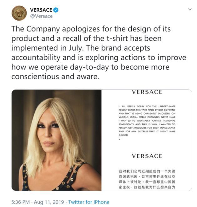 北京時間下午17時30分左右,范思哲在海外主流社交平臺——推特、臉書、Instagram上相繼發布道歉聲明,并附上品牌繼承人暨創意總監Donatella Versace的簽名。其中,范思哲在推特和臉書上發布了中英文兩版聲明,Instagram上則只有英文版聲明。