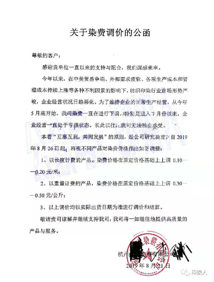 也就在前幾日,發布浙江杭州某染整企業發布《關于染費調價的公函》,稱將于8月26日正式對染整加工費進行調整。