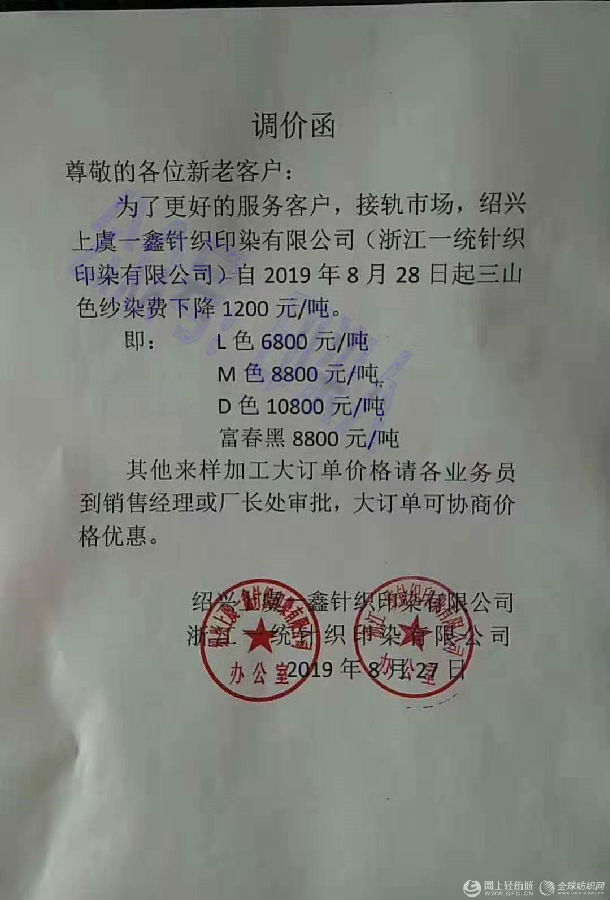 另一份通知是由浙江上虞一鑫針織、浙江一統針織聯合簽章發布《調價函》,在調價函中調整染費下降1200元/噸。