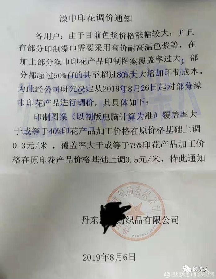 安徽、浙江個別染費這邊染費下調,在微信群中一陣騷動。這邊下調那邊漲來;近日,丹東**紡織品有限公司發布《調價通知》,決定從2019年8月26日起對部分澡巾印花產品進行調價。