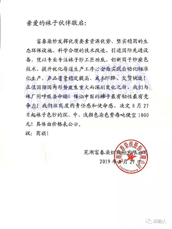 我們以高度的責任感和使命感,決定8月27日起襪子色紗的深、中、淺顏色染色費每噸便宜1000元!具體由價格表公示。