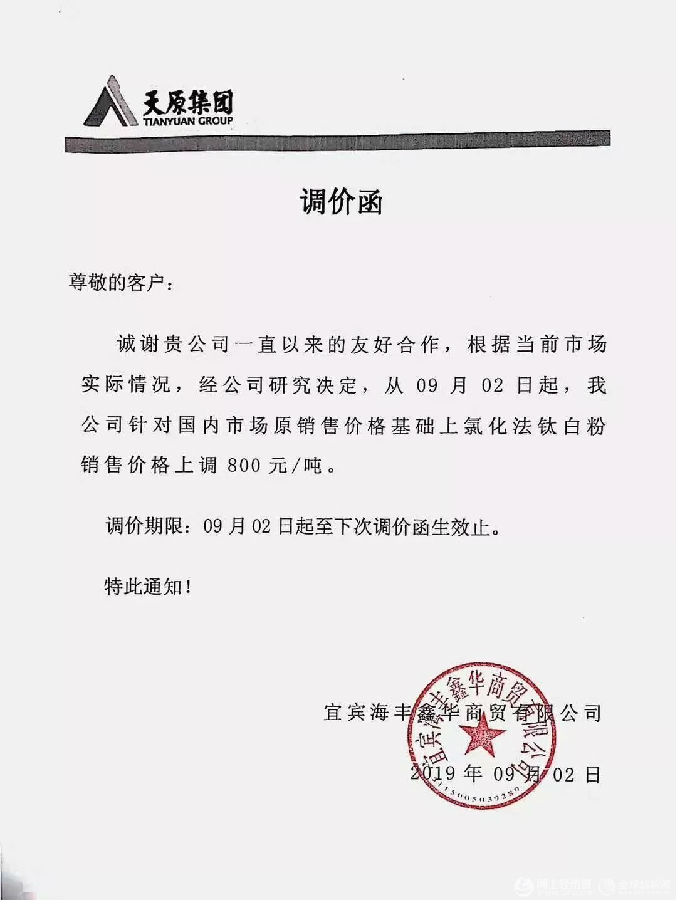 宜賓海豐鑫華商貿(mào)有限公司(以下簡(jiǎn)稱(chēng)“海豐鑫華”)發(fā)布調(diào)價(jià)函稱(chēng),根據(jù)當(dāng)前市場(chǎng)實(shí)際情況,經(jīng)研究決定,自9月2日起,針對(duì)國(guó)內(nèi)市場(chǎng)原銷(xiāo)售價(jià)格基礎(chǔ)上氯化法鈦白粉銷(xiāo)售價(jià)格上調(diào)800元/噸。