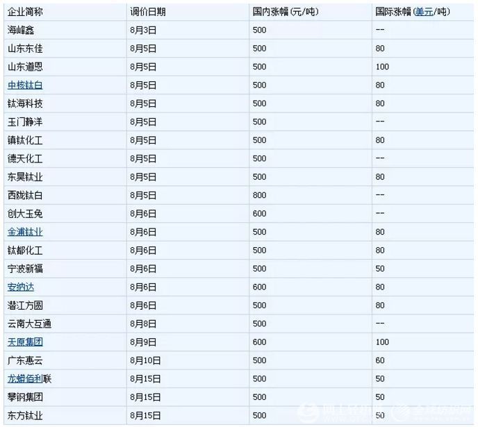 此前在8月8日,海豐鑫華就發(fā)布過(guò)調(diào)價(jià)函,稱(chēng)自8月9日起,其在原銷(xiāo)售價(jià)格基礎(chǔ)上氯化法鈦白粉銷(xiāo)售價(jià)格上調(diào)600元/噸,國(guó)外市場(chǎng)上調(diào)100美元/噸。