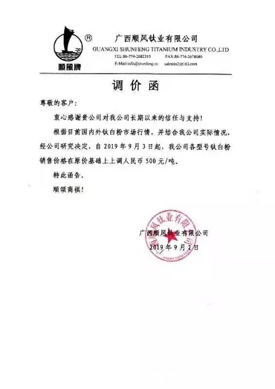 廣西順風(fēng)鈦業(yè)有限公司(簡(jiǎn)稱(chēng)“順風(fēng)鈦業(yè)”)于9月2日發(fā)布的調(diào)價(jià)函內(nèi)容顯示,基于當(dāng)前的市場(chǎng)行情,并結(jié)合該公司的實(shí)際情況,經(jīng)研究決定,從9月3日起,順風(fēng)鈦業(yè)各型號(hào)鈦白粉銷(xiāo)售價(jià)格在原價(jià)基礎(chǔ)上上調(diào)人民幣500元/噸。