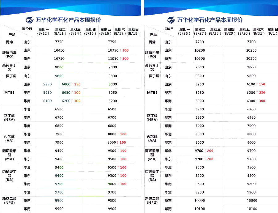 以國(guó)內(nèi)化工巨頭萬(wàn)華化學(xué)為例,近1個(gè)月內(nèi),萬(wàn)華MTBE報(bào)價(jià)上漲兩次,分別為: