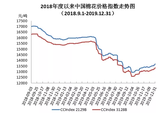 12月,中美貿易磋商進展順利,市場相對樂觀。紡織企業(yè)隨用隨買,受收購成本支撐,棉花現貨價格平穩(wěn)上漲。月末,中國棉花價格指數(CCIndex3128B)13369元/噸,較上月末上漲277元;月均價為13154元/噸,環(huán)比上漲94元,同比下跌2253元。
