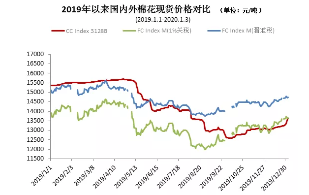 12月,中美雙方第一階段經貿協議達成一致,國際棉價上漲。中國進口棉價格指數FCIndexM月均為76.95美分/磅,環(huán)比漲1.32美分。月末為79.47美分/磅,高于前一月末3.43美分/磅,1%關稅下折人民幣13724元/噸,高于同期國內現貨355元,內外棉價差較上月末擴大191元。
