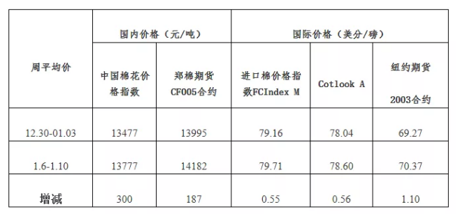 上周(1月6日-10日),受中美將簽署第一階段經(jīng)貿(mào)協(xié)議消息影響,國(guó)內(nèi)外棉花價(jià)格持續(xù)上漲,中國(guó)棉花價(jià)格指數(shù)CCIndex(3128B)周均價(jià)為13777元/噸,環(huán)比上漲300元;CotlookA指數(shù)周均價(jià)為78.60美分/磅,環(huán)比上漲0.56美分,1%關(guān)稅下折人民幣13547元/噸,較中國(guó)棉花價(jià)格指數(shù)CCIndex(3128B)低230元,滑準(zhǔn)稅下14665/噸,較中國(guó)棉花價(jià)格指數(shù)高888元;進(jìn)口棉價(jià)格指數(shù)FCIndexM周均價(jià)為79.71美分/磅,環(huán)比上漲0.55美分;鄭州商品交易所棉花主力合約CF005周均價(jià)14182元/噸,環(huán)比上漲187元;ICE棉花期貨近期合約周均價(jià)為70.37美分/磅,環(huán)比上漲1.10美分。