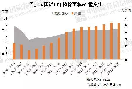 根據(jù)美國農(nóng)業(yè)部(USDA)相關(guān)報告,本網(wǎng)對全球主產(chǎn)棉國與消費(fèi)國的市場情況進(jìn)行了梳理和展望。本文通過對孟加拉國棉花市場基本情況的整理介紹,可見該國政策方面:以促進(jìn)服裝出口為目標(biāo),實(shí)施減免稅費(fèi)、加大補(bǔ)貼等一系列舉措。產(chǎn)量與面積方面:2019/20年度預(yù)期3.09萬噸,同比增3%;面積同比小幅增加至4.5萬公頃。消費(fèi)方面:預(yù)期在154.78萬噸,同比減少4%。進(jìn)口方面:2019/20年度孟加拉棉花進(jìn)口預(yù)期為150萬噸,同比增加逾2%,但低于上次預(yù)期。2019年7-11月服裝出口僅157.7億美元,同比下降7.59%。具體梳理如下: