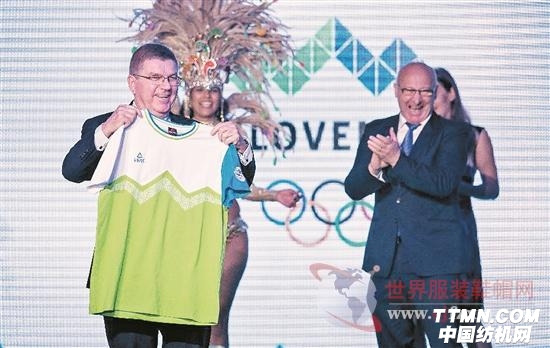 匹克贊助斯洛文尼亞里約奧運服裝,國際奧委會主席巴赫(左)展示一件匹克奧運上裝