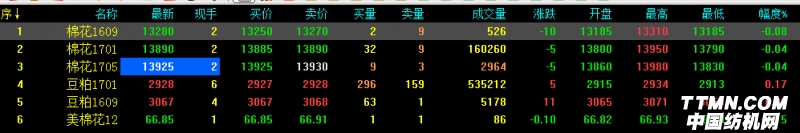 今日鄭棉1609開盤13185跌10最新13280