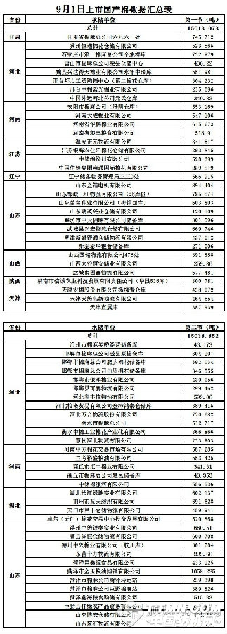 9月1日第一節(jié)銷售儲(chǔ)備棉15013.0730噸,其中國(guó)產(chǎn)棉15013.0730噸,進(jìn)口棉0噸。