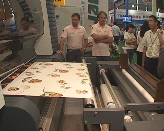斯,它主要是印花在滌綸,雪紡綢一類的,是通過印花以后,通過他的升華加熱把色彩顯現出來,這個它的速度可以做到38平米每小時,它廣泛的運用在家紡行業以及廣告行業,它最大的特點是做到這個兩面做的非常透,顏色顯現非常好,現在給大家作為重點推薦的是那個韓國的機器,這臺使用八個工業型噴頭,所以它能做到每小時高達一百平米每小時,它可以做棉制品,絲綢,滌綸,各類產品,是可以在工業級運用上面,那么它特別在軟件應用上面可以做到色彩完美體現,能夠保持每一匹的顏色都能達到客戶的需求,所以它的亮點就是顏色的顯現度特別好,可以說這些展示材料上面可以看到各種花紋過渡色,色彩的完美表現,特別它顏色的滲透性,可以全部滲透到織物里面,這么厚的織物,油畫布,包括這個絨布,作為本次展會,我們很榮幸的能夠推薦奧地利齊瑪的數碼印花設備到這次展會上來,作為我們摯陽國際非常榮幸能和齊瑪公司一起合作,將這個世界上最先進的設備帶到這個展會上,大家可以看到,它的最高印花速度達到728平米每小時,作為這個行業領先的一個130年歷史的齊瑪的數碼印花設備生產商,這臺設備是這次展會上的唯一的一個亮點,它的高速運行,色彩的完美表現,還有最主要他的環保的應用,廢水排放的減少,用料減少,為這個行業帶來的一個革命化的設備,引起全世界,包括本次展會市場的一個關注,希望這款產品能帶給中國市場一個革新的機會,也希望這個產品能盡快在中國市場得到實際的運用,這是我們的目標,也是一個數碼印花的需要。”