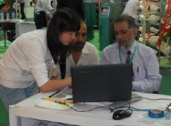 (兄弟機械在2011上海紡機展現(xiàn)場洽談?wù)掌?/p>