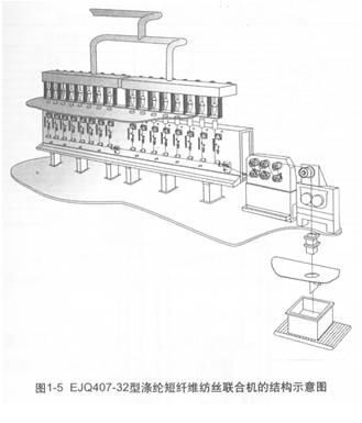 EJQ407-32型滌綸短纖維紡絲聯介機日產滌綸短纖維100噸,是近二年新開發的、帶有自主知識產權的新產品,經過用戶廠近一年的運轉考核,已通過了上海市經委組織的生產鑒定。EJQ407-32型滌綸短纖維紡絲聯合機是由三臺單元機組成,即EJQ449-32紡絲機、EJQ458-32卷繞機和EJQ468-210絲桶往復裝置。其結構示意圖見圖1-5。