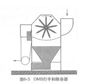·OMB打手和除雜器(圖6-3)??? 適用于任何種類、長度的纖維,尤其適用于廢紡。由二個系統來完成雜質和灰塵的排除:一個足一側有用于噴射重雜質(金屬,塑料等)的配備收集箱裝置;另一個是用于輕雜質(植物類雜質)的由一個漏底和吸塵裝置(風機、袋支架和收集袋)組成的系統。該機標準工作寬度為2500mm,生產能力為1000-2500kg/h。