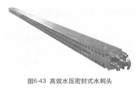 在水刺設備具體結構方面,也作了很多技術改進。水刺頭采用狹縫式出水腔設計結構,其高效水壓密封方式(圖6-43)新穎,高壓水泵采用變頻起動,由壓力傳感器反饋信號,調節變頻裝置,這一技術提高了高壓水的穩定性,并在低壓條件下也能獲得較好的纏結效果。該項技術已申請了國家專利。