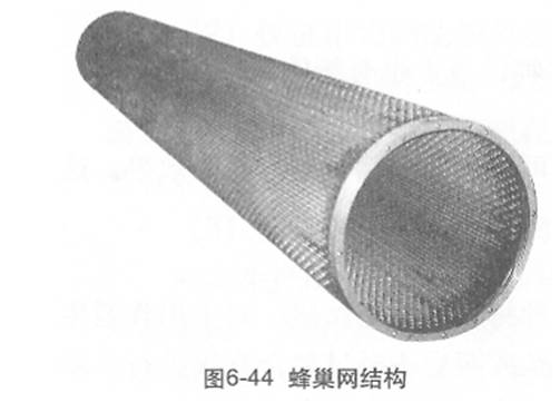 轉鼓設計上采用了蜂巢網結構(圖6-44),為國內首例。這種結構提高了剛性,同時開孔率高達90%,最大限度地降低了能量消耗。表面的反彈網采用了鎳網,增強了水刺的反彈能力,提高了纖維的纏結效果。