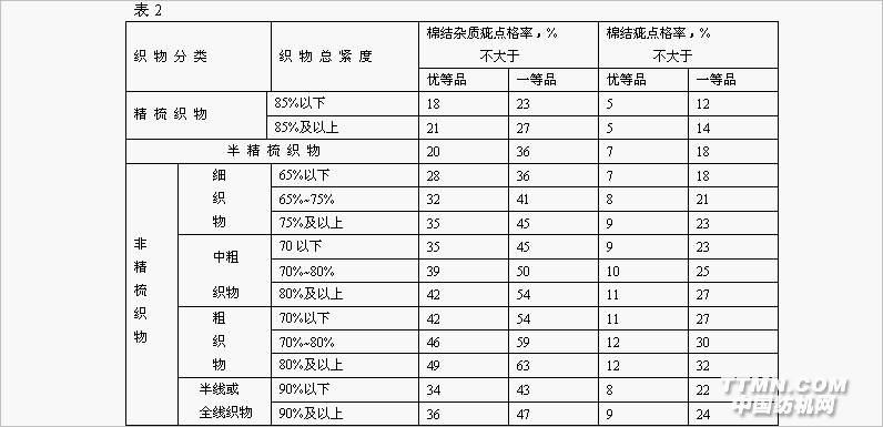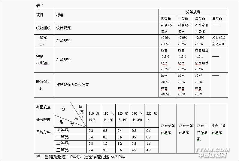 1 主題內(nèi)容與適用范圍 本標(biāo)準(zhǔn)規(guī)定了大提花棉本色布的產(chǎn)品品種、規(guī)格、技術(shù)要求、布面疵點(diǎn)的評(píng)分、試驗(yàn)方法、檢驗(yàn)規(guī)則和標(biāo)志、包裝。 本標(biāo)準(zhǔn)適用于鑒定機(jī)織大提花棉本色布的品質(zhì)。 2 引用標(biāo)準(zhǔn) GB 3923 機(jī)織物斷裂強(qiáng)力和斷裂伸長的測定(條樣法) GB/T 406 棉本色布 GB 4666 機(jī)織物長度的測定 GB 4667 機(jī)織物幅寬的測定 GB 4668 機(jī)織物密度的測定 FZ/T 10004 棉及化纖純紡、混紡本色布的檢驗(yàn)規(guī)則 FZ/T 10006 棉及化纖純紡、混紡本色布棉結(jié)雜質(zhì)疵點(diǎn)格率檢驗(yàn) ZB W04 006.2 溫度與回潮率對(duì)棉及化纖純紡、混紡制品斷裂強(qiáng)力的修正方法 本色布斷裂強(qiáng)力的修正方法 ZB W08 002 棉及化纖純紡、混紡本色布包裝和標(biāo)志 3 產(chǎn)品品種、規(guī)格 大提花棉本色布的品種、規(guī)格,根據(jù)用戶需要,由生產(chǎn)部門按技術(shù)條件的規(guī)定制訂。 4 技術(shù)要求 4.1 技術(shù)要求項(xiàng)目 技術(shù)要求項(xiàng)目有織物組織、幅寬、密度、斷裂強(qiáng)力、棉結(jié)雜質(zhì)疵點(diǎn)格率、棉結(jié)疵點(diǎn)格布面疵點(diǎn)七項(xiàng)。 4.2 分等規(guī)定 4.2.1 大提花棉本色布的品等分為優(yōu)等品、一等品、二等品和三等品,低于三等品的為等外品。 4.2.2 大提花棉本色布的評(píng)等以匹為單位,織物組織、幅寬、布面疵點(diǎn)按匹評(píng)等,密度、斷裂強(qiáng)力、棉結(jié)雜質(zhì)疵點(diǎn)按批評(píng)等,以其中那個(gè)最低一項(xiàng)品等作為該匹布的品等。 4.2.3 分等規(guī)定見表1和表2。.jpg)