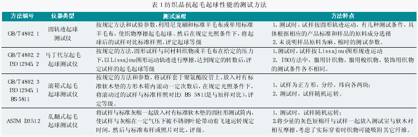 1 測試方法 在使用過程中,紡織品不可避免地要反復(fù)經(jīng)受摩擦,很多織物中的纖維兩端會(huì)露出表面,形成茸毛,當(dāng)這些茸毛不能很快脫落而繼續(xù)經(jīng)受摩擦?xí)r,就會(huì)形成顆粒狀,呈現(xiàn)“起球”,從而使織物的外觀受損,因此備受消費(fèi)者關(guān)注。 為了規(guī)范對紡織品抗起毛起球性能的評價(jià),國內(nèi)外相關(guān)機(jī)構(gòu)制定了紡織品抗起毛起球性能的測試方法標(biāo)準(zhǔn),常用方法標(biāo)準(zhǔn)編號、使用儀器類型、測試原理及各類方法的特點(diǎn)見表1。