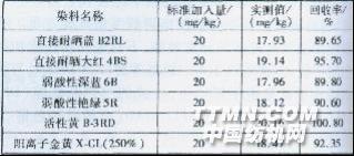 圖3甲醛標(biāo)準(zhǔn)工作曲線 按該方法,對空白樣品進(jìn)行10次測定,對組分背景噪聲標(biāo)準(zhǔn)偏差3倍所相當(dāng)?shù)暮恐担礊闄z測限,本方法檢出限為0.025 mg/L(換算至織物中的甲醛含量為2.5 mg/kg)。2.5色度的影響 為了解本試驗方法在測定紡織品中游離甲醛時是否受萃取液色度的影響,選取幾類常用染料,分別配制成0.01%水溶液,模擬易褪色紡織品的水萃取液,加入已知濃度的甲醛標(biāo)準(zhǔn)溶液驗證,發(fā)現(xiàn)其回收率在89.65%~100.80%。結(jié)果見表1。表1色度影響結(jié)果