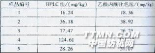 2.6與國家標(biāo)準(zhǔn)方法比較 選用不易褪色紡織品分別采用HPLC法和乙酰丙酮比色法[GB/T 2912.1一1998《紡織品甲醛的測定第1部分:游離水解的甲醛(水萃取法)》],檢測結(jié)果見表2。兩組數(shù)據(jù)的相關(guān)系數(shù)R2=0.999 3,置信水平為99.9%,表明兩種方法所得的結(jié)果無顯著差異。 表2 HPLC法與國家標(biāo)準(zhǔn)方法比較