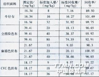 2.7樣品分析和回收率 將紡織品水萃取液衍生反應(yīng)后進(jìn)行HPLC測定,同時進(jìn)行加標(biāo)回收試驗。由于常規(guī)的標(biāo)準(zhǔn)添加法可能會導(dǎo)致甲醛與紡織纖維的結(jié)合,從而影響回收率的測定。因此,本法采用在萃取液中加入不等量的甲醛標(biāo)準(zhǔn)溶液進(jìn)行回收率試驗。表3為樣品的測定結(jié)果和回收率。其中,每個樣品測定6次,取平均值,其甲醛的回收率在89.50%~101.69%,說明方法可靠。 表3紡織品測定結(jié)果和回收率