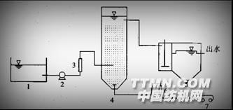 1:調(diào)節(jié)池 2:原水泵 3:流量計 4WL40A2H反應(yīng)器 5:過濾池 6:空氣流量計 7:鼓風機2、流程說明生產(chǎn)線排出的廢水,通過廠區(qū)污水管道,匯集到安裝有粗細二道格柵的調(diào)節(jié)池,去除大顆粒的固體懸浮物,并調(diào)節(jié)廢水水量、均衡水質(zhì)。然后由一級提升泵提升至復級離子混合反應(yīng)器,經(jīng)物理沉淀、化學斷鏈、單鍵破壞、生物降解、光崔化氧化等過程達到脫色混凝沉淀、氧化還原等機理脫除廢水中的污染物質(zhì)。其出水提升到物理過濾池過濾后,自流到清水池經(jīng)計量后,備工藝回用或排放,排放水達到國家排放標誰。復級離子反應(yīng)器產(chǎn)生的廢污泥都排入污泥干化池重力澄清后(約需30分鐘)排出清液,沉淀污泥混入然料然燒(其熱值不低于2300大卡)。