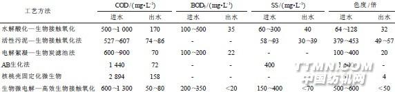 1.1.1 生物膜法生物膜法是通過生長在填料如濾料、盤面等表面的生物膜來處理廢水的方法。常用的生物膜法主要有生物接觸氧化法、生物轉(zhuǎn)盤和生物炭法等。表2列舉了幾種最新的生物膜處理工藝。表2 生物膜法處理印染廢水的幾種最新工藝及其處理效果