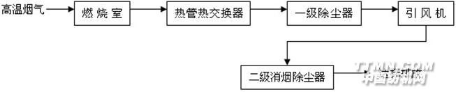一、基本原理(見示意圖)原理:高溫煙氣先經過燃燒室,使一氧化碳和碳氫化合物充分燃燒,然后進入熱管熱交換器,將煙氣中的熱量提取出來,使其溫度降至150℃以下,當進入一級除塵器時,既繼續降溫又去除85%的煙塵,進入引風機時,煙氣溫度已降至100℃以下。