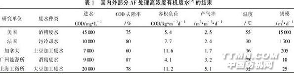 AF是美國斯坦福大學的2位學者首先研制的。裝置中填滿了砂礫、卵石、塑料或纖維等,厭氧微生物附著在填料的巨大表面上,可維持較高的生物量和較少的SRT。一般采用上流式,在中溫條件下也可采用下流式。表1為國內外AF商業應用效果。