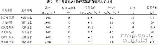 UASB是荷蘭農業大學幾名教授在AF基礎上發展起來的,其特點是反應器的上部設置1個氣、固、液三相分離器,混合液中的污泥能自動回到反應區以維持較多的生物量和較長的SRT,整個反應器由反應區和沉淀區兩部分組成。從表2可以看出,UASB具有很高的容積負荷率和污泥負荷率。