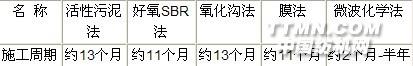 6.施工簡單、周期短:用微波能水處理技術處理設施較少,無需大量的土建工程,因此施工周期很短,以日處理30000噸生活污水的工程為例: 表4:污水處理施工周期的比較