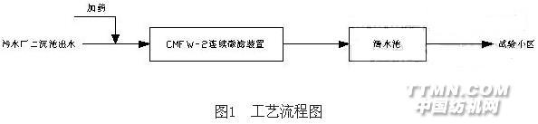 試驗用水取自北京北小河污水處理廠二沉池,北小河污水處理廠二沉池出水經加藥后進入CMFW-2連續微濾裝置進行處理,處理水進入清水池,清水池出水供給試驗小區回用。1. 2試驗裝置CMFW-2連續微濾裝置是武漢市思藍凈水技術有限公司研發的CMFW系列連續微濾設備。CMFW-2連續微濾裝置是由混凝沉淀罐、粗濾罐、微濾膜組件、壓縮空氣系統、組合式反沖洗系統、CIP化學清洗系統和PLC自控系統等所組成。二沉池出水投加混凝劑,經由管式混合器混合后進入混凝沉淀罐,混凝沉淀罐出水通過粗濾罐過濾,粗濾罐出水由離心泵壓入微濾膜組件過濾,從而得到