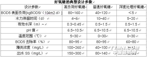 好氧塘的設(shè)計計算(1)設(shè)計方法:實際工程中多采用經(jīng)驗數(shù)據(jù)進行設(shè)計,即BOD5表面負荷法。下表是好氧塘的典型設(shè)計參數(shù):