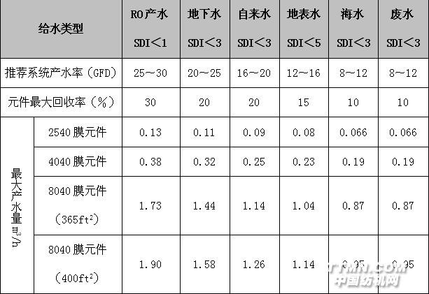 給水類型RO產水SDI<1地下水SDI<3自來水SDI<3地表水SDI<5海水SDI<3廢水SDI<3推薦系統產水率(GFD)25~3020~2516~2012~168~128~12元件最大回收率(%)302020151010最大產水量m3/h2540膜元件0.130.110.090.080.0660.0664040膜元件0.380.320.250.230.190.198040膜元件(365ft2)1.731.441.141.040.870.878040膜元件(400ft2)1.901.581.261.140.950.95