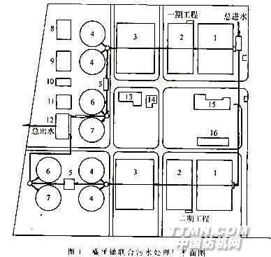 1-厭氧池;2-好氧池1;3-好氧池2;4-二沉池;5-反應(yīng)槽;6-混凝池;7-沉淀池;8-事故污泥池;9-脫水機房;10-濃縮池;11-藥庫;12-出水泵房;13-鼓風(fēng)機房;14-配電房;15-辦公樓;16-化驗、機修房