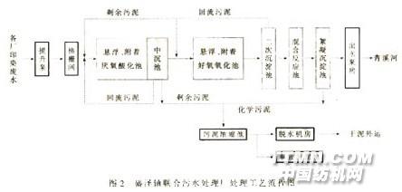 二、工藝流程和特點 該工程設(shè)計流程是采用天津大學(xué)環(huán)境工程系所取得的國家“七五”科技攻關(guān)成果“懸浮、附著生物厭氧-好氧-微絮凝處理印染廢水”工藝,具體流程如圖2所示。