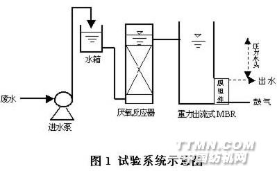 膜生物反應器(MBR)具有流程短、易操作、水處理效率高、出水可直接回用等特點而日益受到重視。尤其是在處理效果方面,MBR對有機物的去除效果較傳統生物處理法更為突出。毛紡印染廢水中含多種染料等難降解有機物,傳統生物處理技術對其去除效果往往不理想,處理后的廢水難以達標排放。本研究采用重力出流式膜生物反應器工藝對毛紡印染廢水進行了試驗研究。重力式膜生物反應器是利用液位水頭,重力驅動出水,在保留MBR處理效率高等優點的同時,省去傳統的一體式MBR出水抽吸泵及復雜的反沖洗設備。整個系統結構緊湊,投資少,操作簡便。 1 研究方法 針對毛紡印染廢水的特點,本研究采用的試驗系統如圖1所示。厭氧反應器容積25L,內裝填料;重力出流式膜生物反應器的好氧反應器容積25L,曝氣量為0.2~0.6m3/h,膜單元采用中空纖維微濾膜,材料為聚偏氟乙烯(PVDF), 孔徑為0.22μm,總面積0.18m2。試驗系統的厭氧反應器主要作用是通過水解酸化,破壞染料等有機物的分子結構,以利在后續好氧反應進一步降解,達到最終去除的目的。