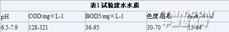 試驗用毛紡印染廢水取自北京某毛紡廠污水站,經0.5mm篩板篩濾(水質情況見表1)。廢水組分較復雜,含有染料、染化助劑、毛料漂染過程產生的各種污染物。