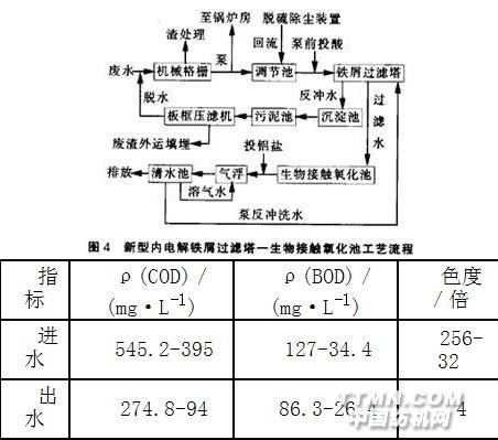 長(zhǎng)沙毛巾集團(tuán)公司采用內(nèi)電解鐵屑過(guò)濾塔作為印染廢水的預(yù)處理單元,鐵屑過(guò)濾塔的填料有鐵屑與輔料按1.5:1的比例組成,輔料的加入可以防止鐵屑板結(jié)和塔內(nèi)溝流并提高脫色效果。其工藝流程如圖4,處理結(jié)果見(jiàn)表3。