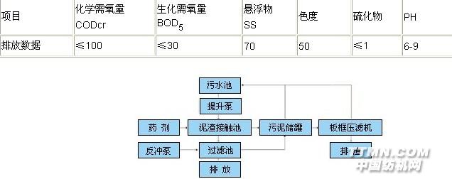 該廠滿負荷生產是四排污水約4000M3,生產中使用的染料主要為分散染料和直接染料。活性染料和硫化染料使用較少,污水水溫不高,漿料主要用樹脂漿料。 污水經過泵提升進入脈沖泥渣接觸反應器,通過該設備內部泥渣層的吸附,緩沖和添加藥劑的反應去掉污水中的污染物,澄清污水自流入反應粒度沉淀池,去除較細小的懸浮物,脈沖泥渣接觸反應器的多余泥渣排入污泥罐,經過濾的污水進入活性炭塔,出水可達標準排放。 該方法的處理流程簡單,操作管理方便,動力消耗低,藥劑用量小,對水質突變有一定的緩沖能力,但處理效率稍低。 設計出水水質:按《紡織染整工業廢水污染物排放標準》(GB4287-92)中1992年12月31日之前立項的紡織、染整工業建設項目及建成投資的企業排放標準執行。 單位:mg/l (PH 色度除外)