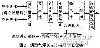 寧波某紡織有限公司采用的CAF系統(tǒng)是美國HydroCal環(huán)保公司專門為去除污水中的油脂與膠狀物和固體懸浮物而設(shè)計的系統(tǒng),其原理是通過獨特的渦旋曝氣機將微泡注入廢水中,工藝流程見圖3。實際使用證明:該系統(tǒng)非常適合于洗毛染色廢水的處理,其處理效果:COD:70%;BOD:46%;SS:90%以上。
