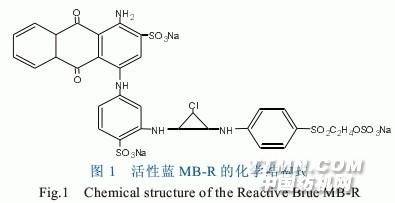 1.2染色廢水 試驗所用的染色廢水取自浙江某印染廠,廢水主要含有活性染料(活性藍MB-R)、無機鹽(NaCl)和少量的染色助劑;其中活性藍MB-R的含量約為 0.2 g·L-1、無機鹽(NaCl)濃度約為8 g·L-1。活性藍MB-R的化學結構式如圖1所示,分子量為911,最大吸收波長為605 nm。在對實際染色廢水進行反滲透膜法深度處理前,并采用1.0μm的微濾膜對廢水進行預過濾,以去除機械性雜質和其他懸浮物質。.jpg)