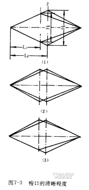 在梭口滿開時,若某頁綜框的梭口高度Hi(i=1,2…)與該頁綜框到織口的距離Li(i=1,2…)成正比,則梭口前部的上層經紗應在一個平面中,下層經紗處在另一個平面,這種梭口叫清晰梭口,如圖7-3(1)所示。在其它條件相同的情況下,清晰梭口的前部具有最大的有效空間,引緯條件最好,但是,當綜框頁數較多或綜框間距較大時,后幾頁綜框的梭口高度過大,以致于相應的經紗伸長過大,產生斷頭。為了緩解這一矛盾,通常將后幾頁綜框的梭口高度適當減小,其結果使下層經紗不處在一個平面內,上層經紗也不處在另一個平面內,這種梭口稱為非清晰梭口,如圖7-3(2)所示。雖然這種梭口各頁綜框動程差距縮小,經紗張力比較均勻,但其前部有效空間小,對引緯極為不利,易造成經紗斷頭、跳花、軋梭及飛梭等織疵或故障,故在實際生產中一般不采用這種梭口,而采用半清晰梭口,即下層經紗處于一個平面內,上層經紗不處在一個平面內的梭口,如圖7-3(3)所示。當織制細特高經密平紋織物(如府綢、羽絨布等),通常采用小雙層梭口,如圖7-4所示。該梭口屬非清晰梭口,即不論在上層或下層,總是第三頁綜的經紗高于第一頁綜的經紗δ,第四頁的經紗高于第二頁綜的經紗δ,這樣可使第一、三頁綜框與第二、四頁綜框的綜平位置錯開,相當于全部經紗交錯時密度減半,有利于開清梭口。
